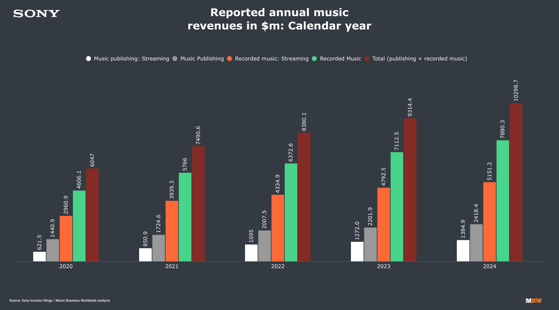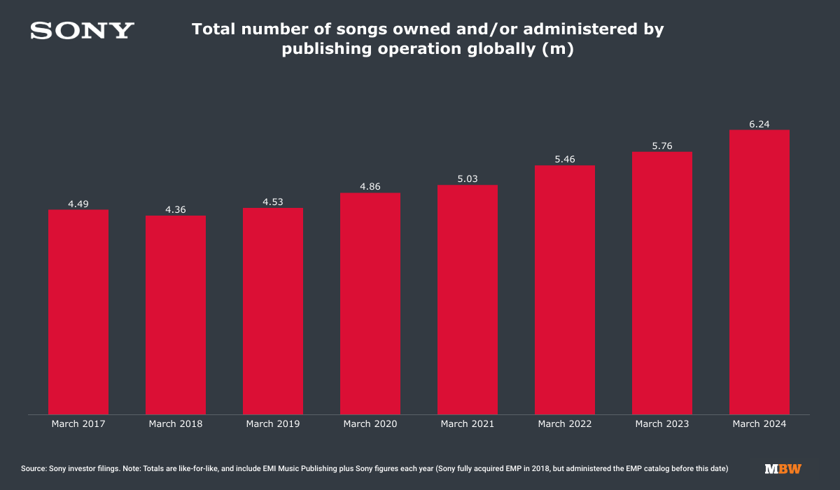 Sony’s global Recorded Music operation generated $7.88 billion in calendar 2024, according to MBW’s calculation; the firm’s global Music Publishing division, led by Sony Music Publishing, generated $2.42 billion.