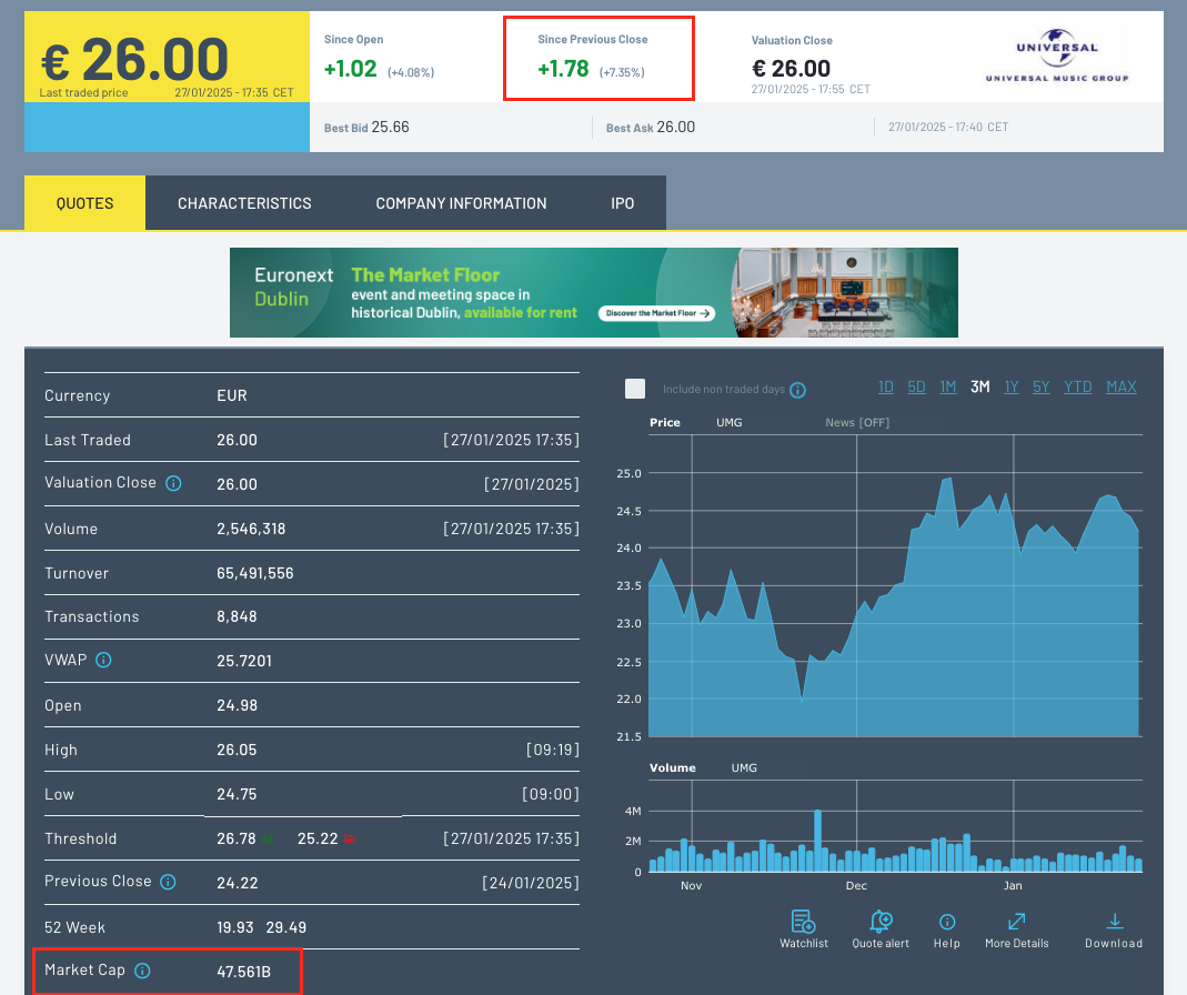 The share price of UMG’s rival Warner Music Group, which trades on the Nasdaq in the US, was up by 4.70% at today’s trading close vs. the trading close on Friday (January 24).