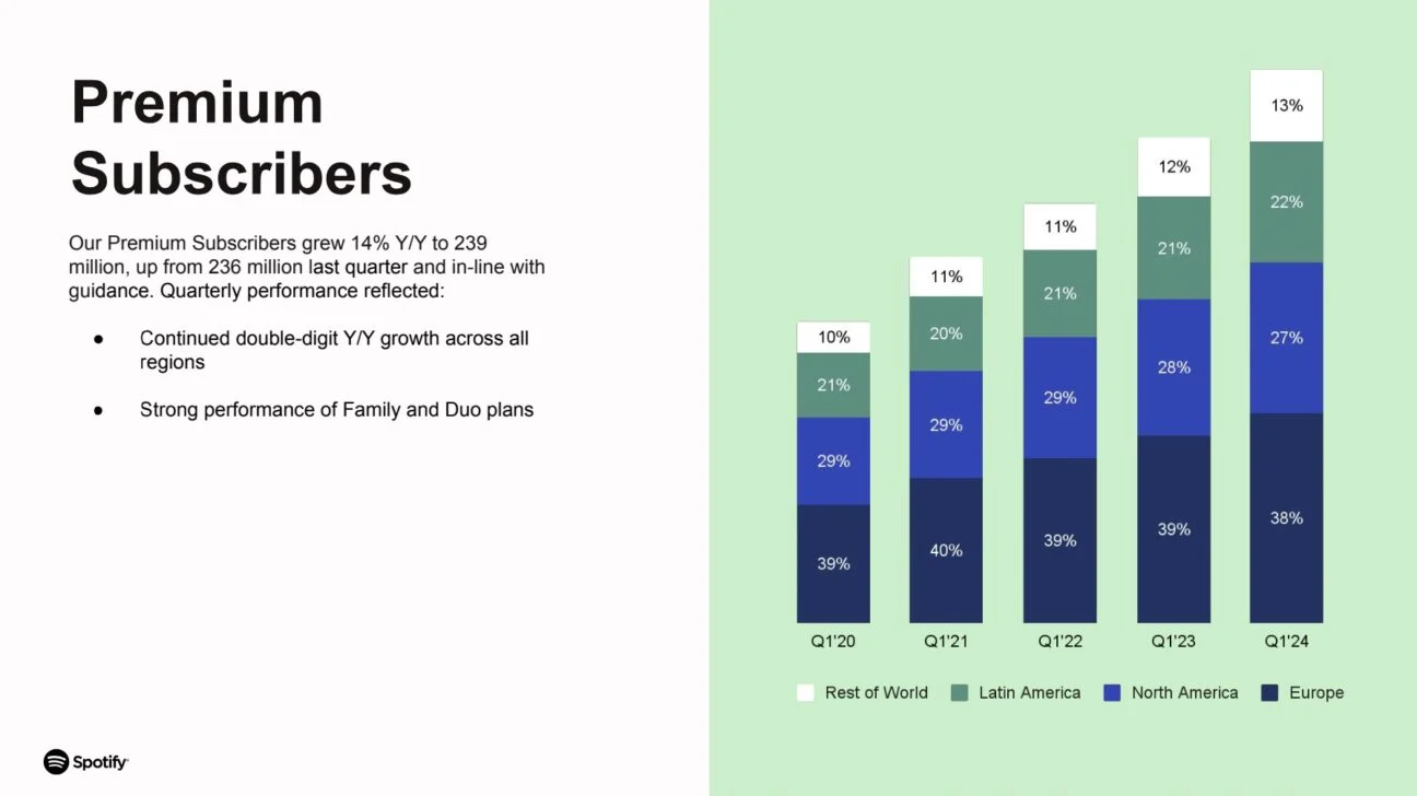The company saw its global Premium Subscriber base grow to 239 million paying users in Q1, up 14% YoY, and up by 3 million net subscribers on the 236 million that SPOT counted at the end of the prior quarter (Q4 2023). (see below).