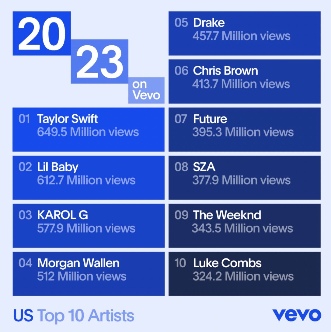 In Vevo’s ranking of US Top 10 Artists in terms of views, Lil Baby came in at second with 612.7 million views, followed by Karol G (577.9m views), Morgan Wallen (512m views), Drake (457.7m views), Chris Brown (413.7m views), Future (395.3m views), SZA (377.9m views), The Weeknd (343.5m views), and Luke Combs (324.2m views).