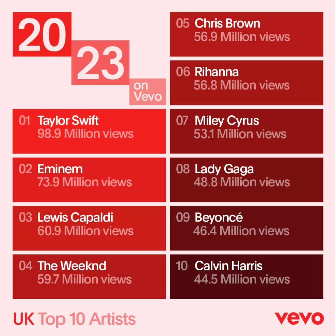 Taylor Swift is also Vevo’s ‘Most Watched Artist’ in the UK, garnering 98.9 million views in 2023.