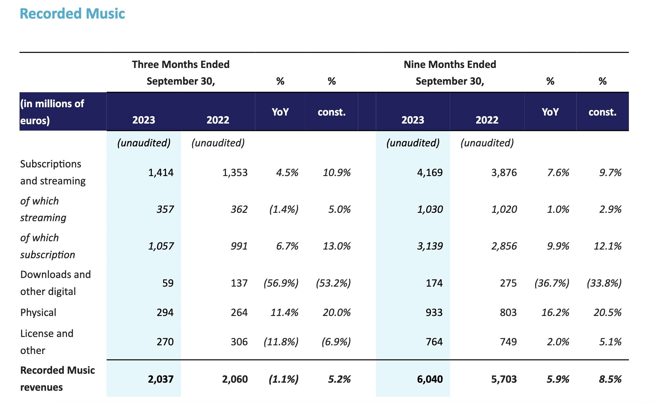 Universal’s overall recorded music revenues for Q3 2023 (including streaming plus physical etc.) were €2.037 billion ($2.21bn) up 5.2% YoY at constant currency (see below).