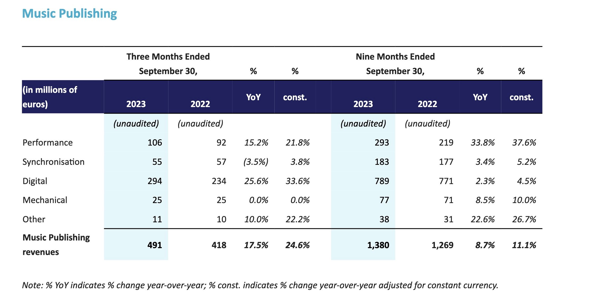 Within Music Publishing, Digital revenue grew 33.6% YoY at constant currency to €294 million ($319.98m) in Q3.
