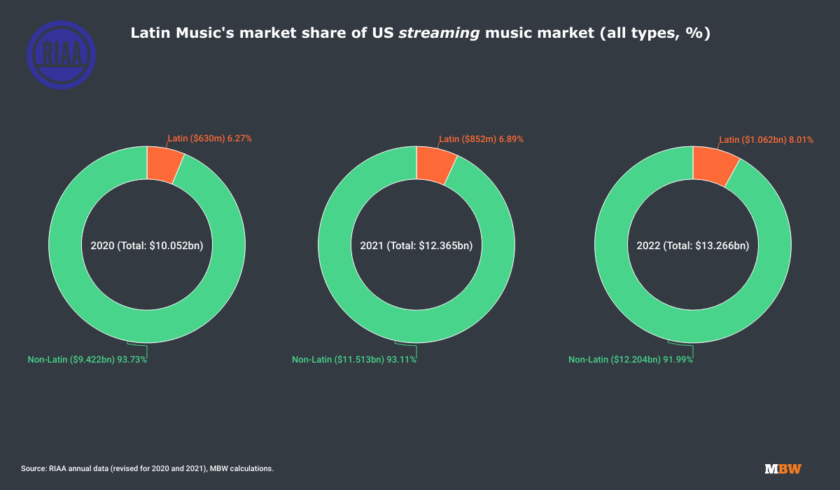 Latin music, in turn, claimed an 8% market share of total US streaming revenues last year, according to MBW calculations of RIAA data (see above).