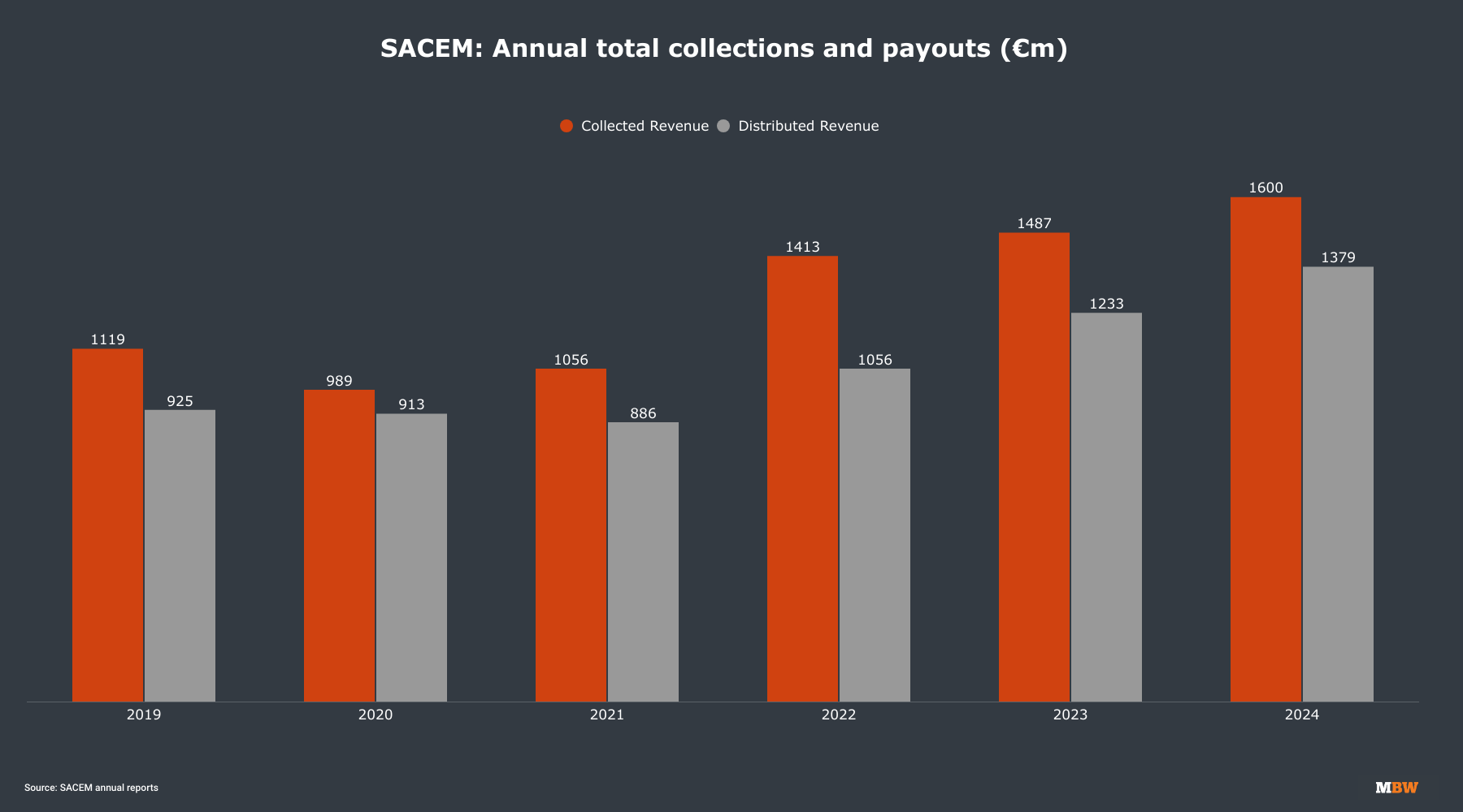 Combined revenues were up 7.7% from the reported€1.487 billion ($1.61 billion) in 2023. In comparison, revenues at ASCAP, the American Society of Composers, Authors and Publishers, jumped5.7% YoY in 2024 to $1.835 billion, while that of Germany’s GEMAclimbed 4.7% YoY to €1.133 billion ($1.226bn).