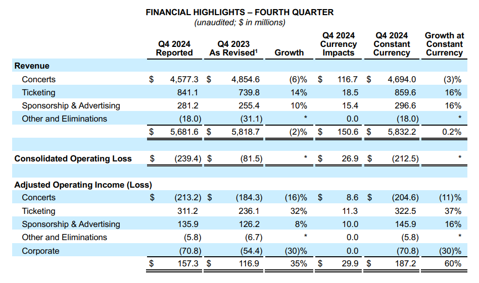 Revenue from concerts came in at $19.02 billion in calendar 2024, up 2% YoY. In Q4, concert revenue totaled $4.58 billion, down 6% YoY.