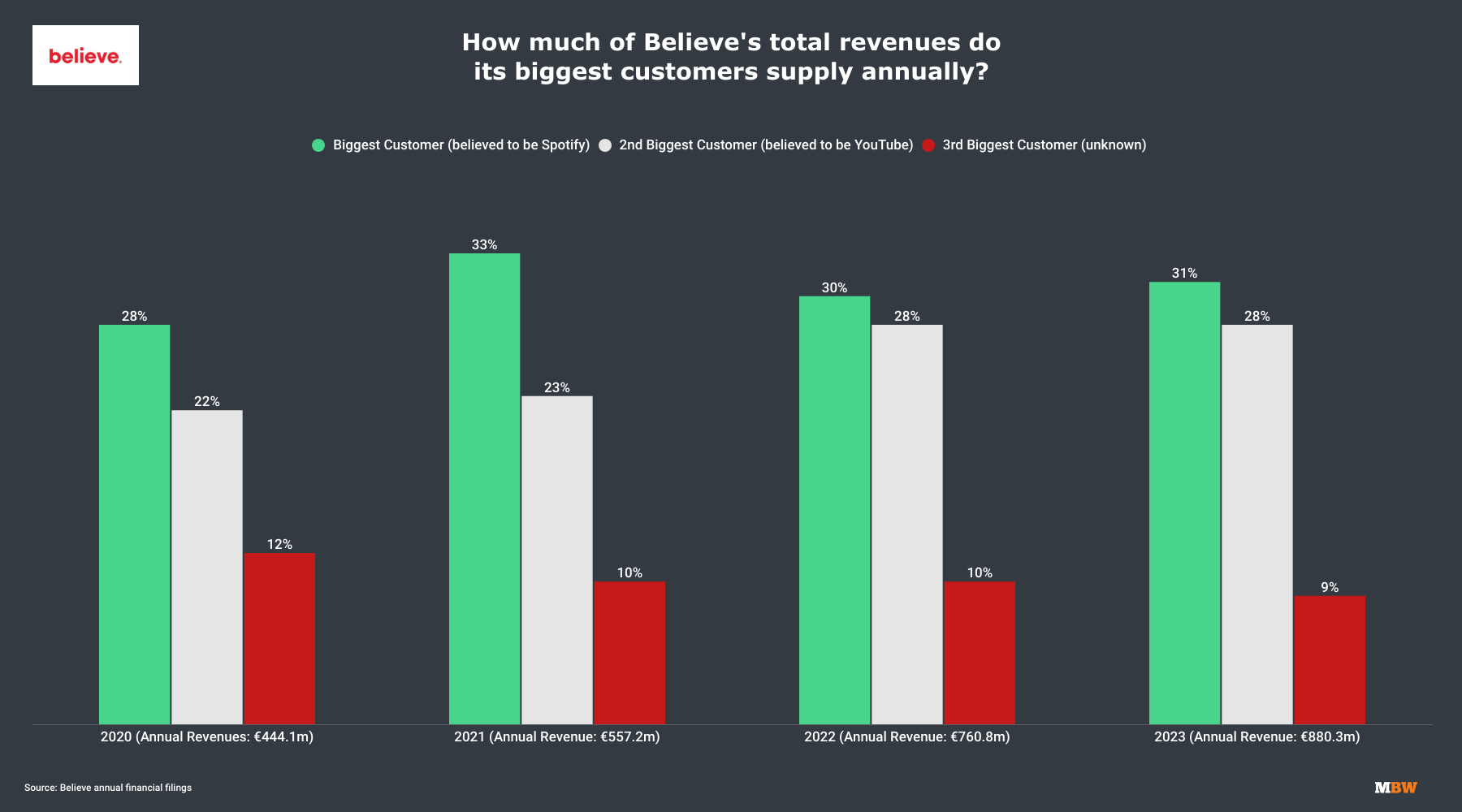 Within these financials, Believe reveals the percentage of its total revenues provided by its three biggest customers each year.