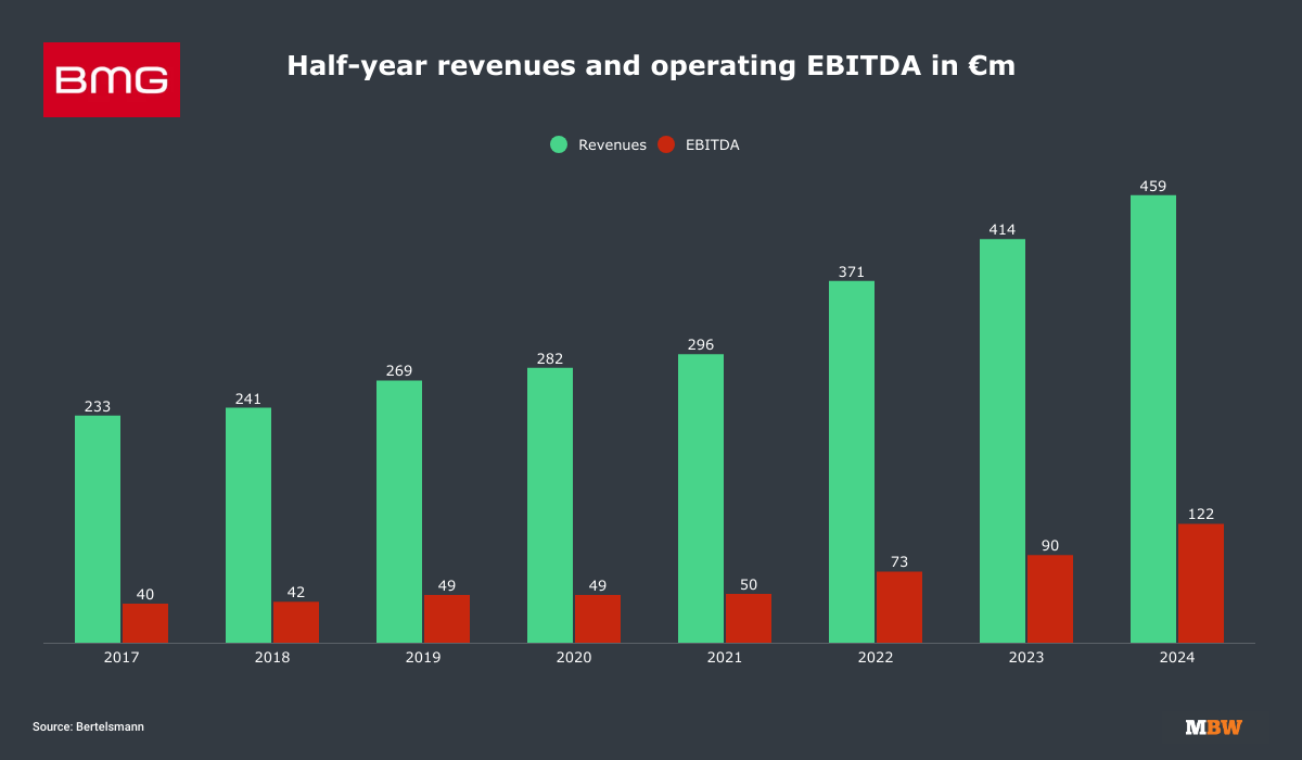 The half-year revenues of BMG, up to June 30 (inclusive) each year, are announced by parent company Bertelsmann in calendar H2 annually.