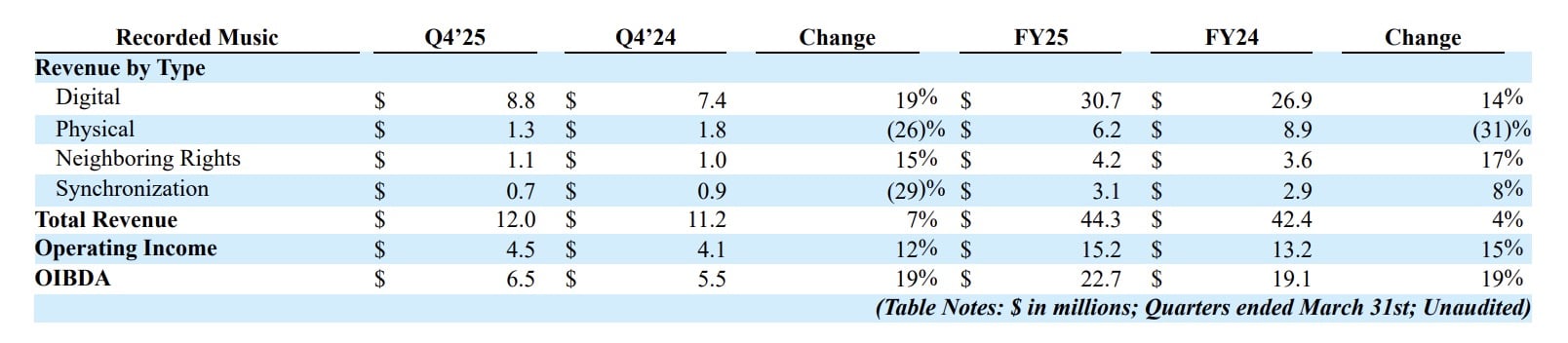 Recorded Music Revenue in Reservoir’s FY fiscal 2025 was $44.3 million, an increase of 4% YoY compared to $42.4 million in the prior year.