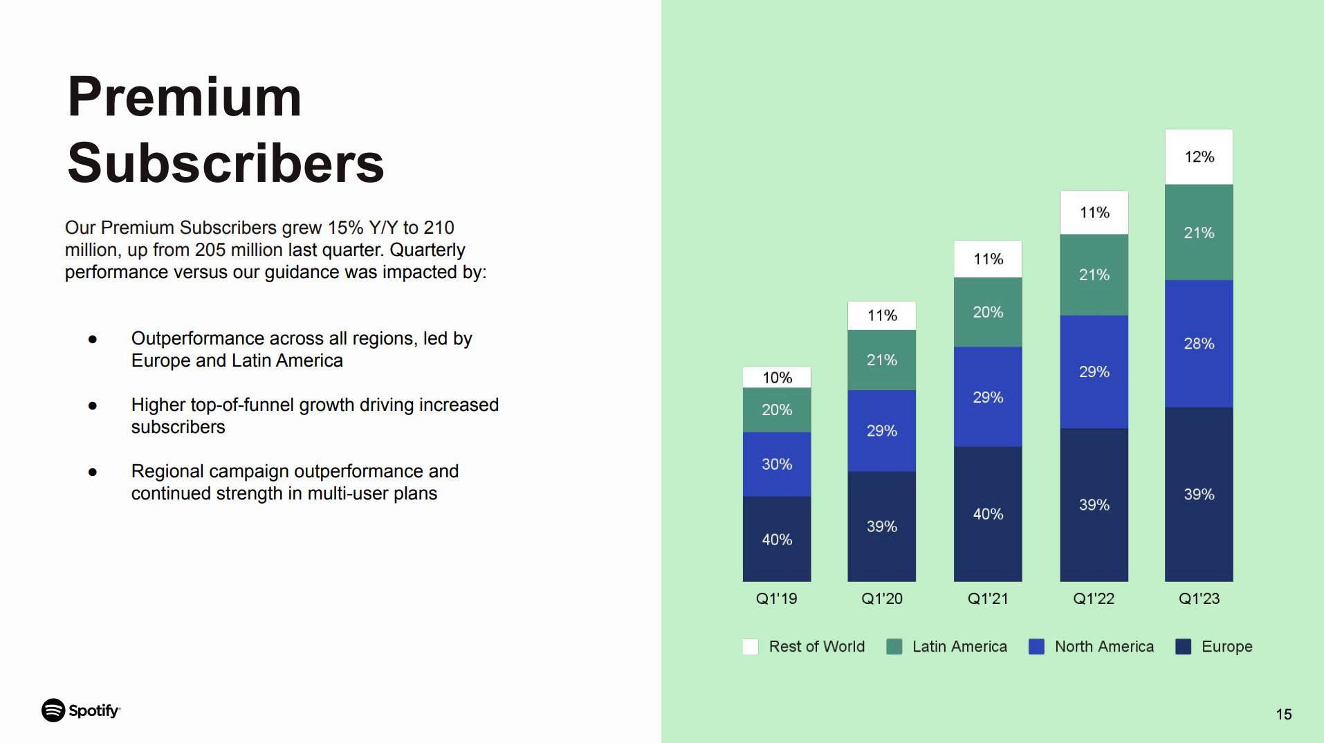 According to Spotify’s own Q1 2023 report, reflecting the end of March, it had 210 million Premium subs globally, of which approximately 28% resided in North America.