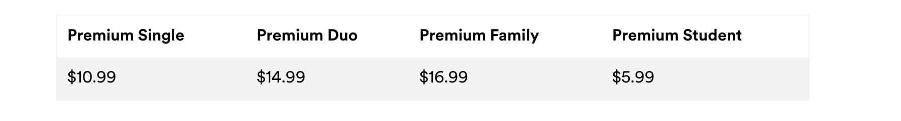 Premium Family also went up by +$1 per month (from $15.99 to $16.99), as did Premium Student (from $4.99 per month to $5.99 per month).