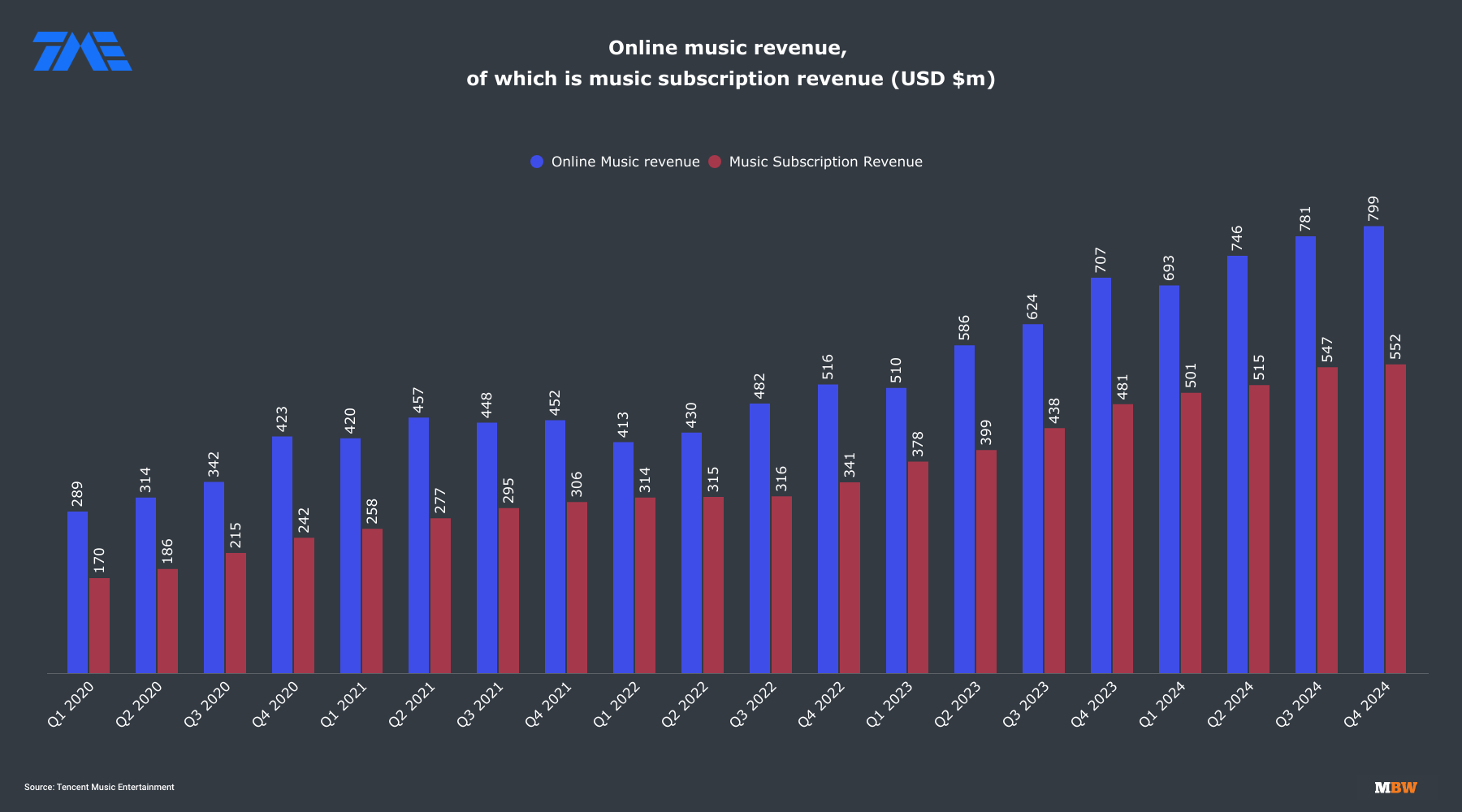 TME reported strong financial results in 2024, with subscription revenue increasing 25.9% year-over-year to RMB 15.23 billion (USD $2.12 billion).