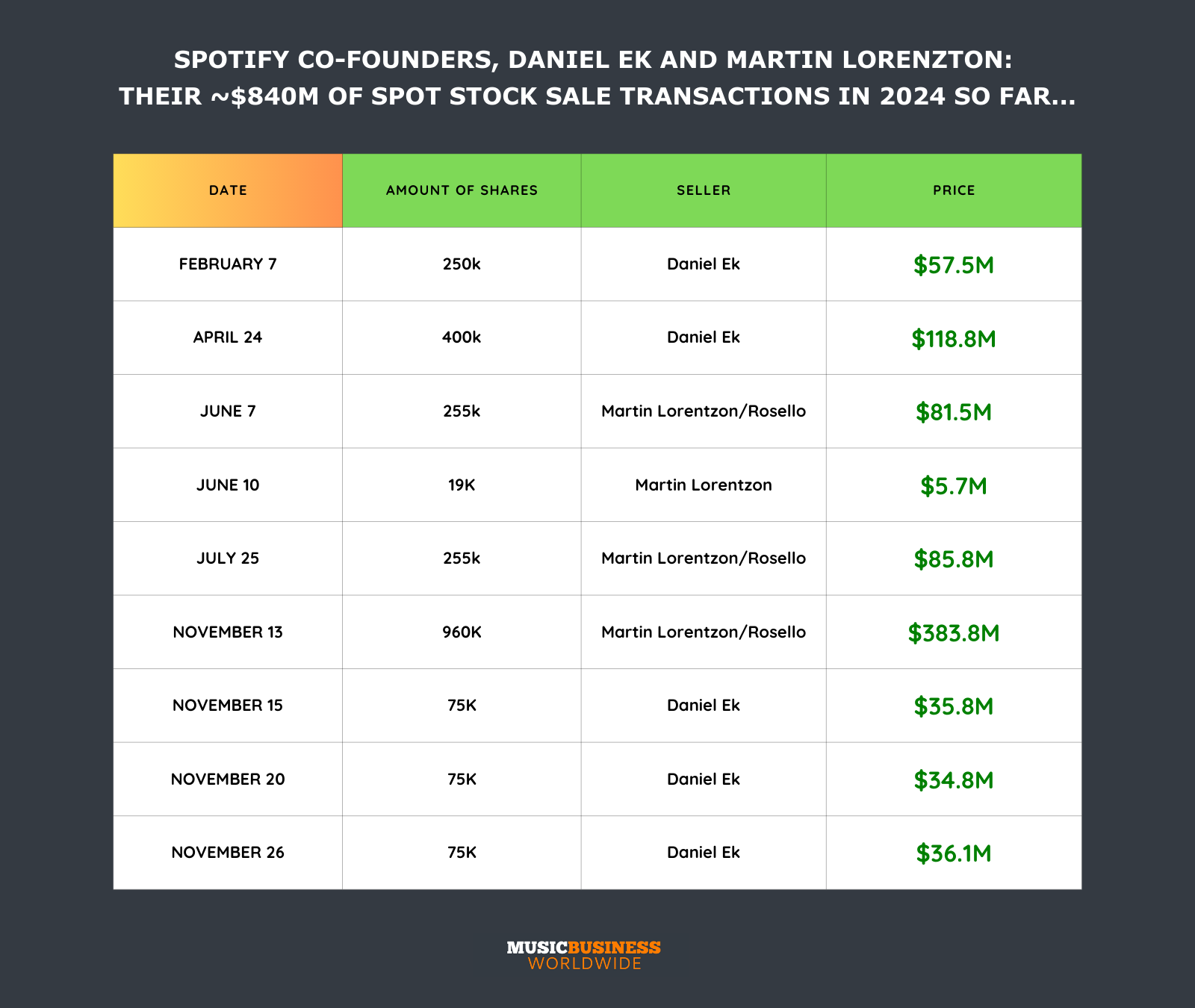 SEC filings reviewed by Music Business Worldwide show that the company’s execs and former execs have unloaded a whopping USD $1.10 billion worth of Spotify stock since the start of the year.
