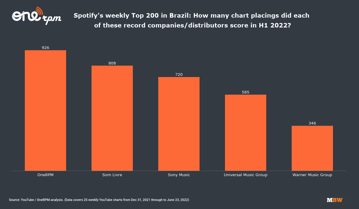 ONErpm’s success in Brazil certainly isn’t limited to Spotify: On YouTube, for example, it beat the likes of Universal Music and Warner Music in the first half of 2022 in terms of the number of distributed artists taking places on the platform’s weekly Top 100 (see below).