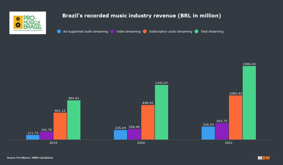 According to IFPI statistics, Brazil was the world’s 10th largest recorded music market in 2021. And according to local trade body ProMusica, Brazil’s annual subscription streaming revenue shot up by 28% YoY in 2021, to BRL 1.084 billion (around $219m).