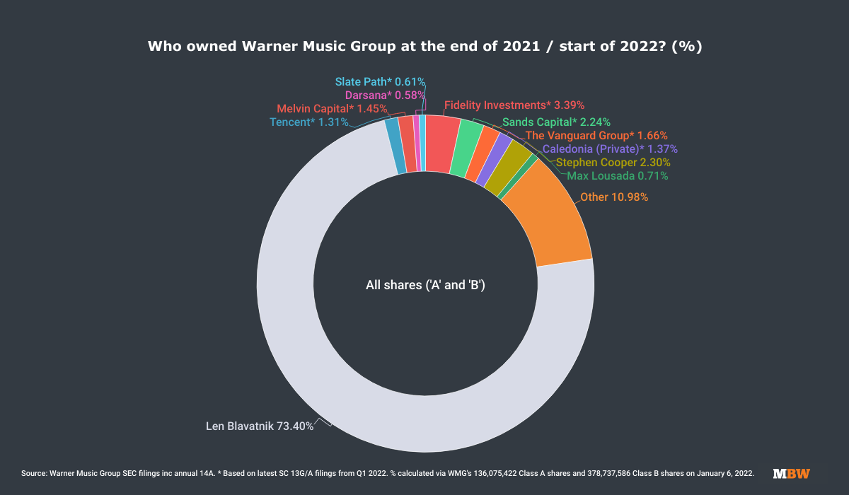 Len Blavatnik personally controlled 73.03% of Warner Music Group’s total outstanding shares as of the start of this year, according to MBW’s calculations based on Warner’s SEC filings (see below).