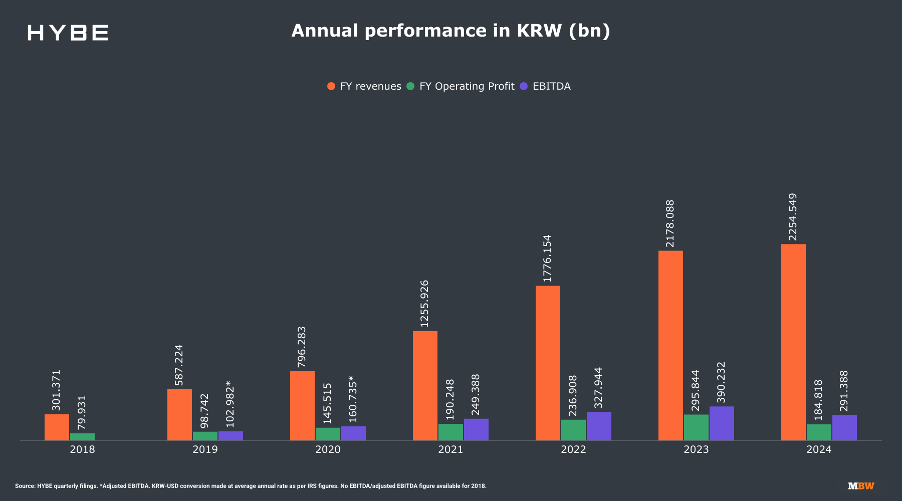 In latest earnings report, HYBE recorded revenues of KRW 2.2545 trillion, or USD $1.654 billion at the average exchange rate for 2024. That was up by 3.5% year-on-year.