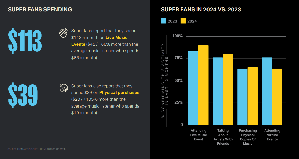 Superfans are those who are willing to pay more for a better experience – be it higher quality sound, merchandise, exclusive access to artists and/or pre-release content, or physical music purchases. They are also among the likeliest to attend live music events, which “benefitt[ed] substantially” from superfans in 2024, Luminate said.