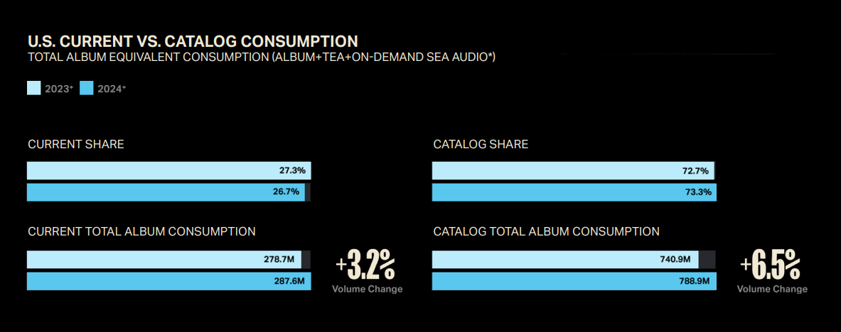 The report found that total album consumption of catalog music grew slightly in the share of overall music consumption, to 73.3% from 72.7% a year earlier.