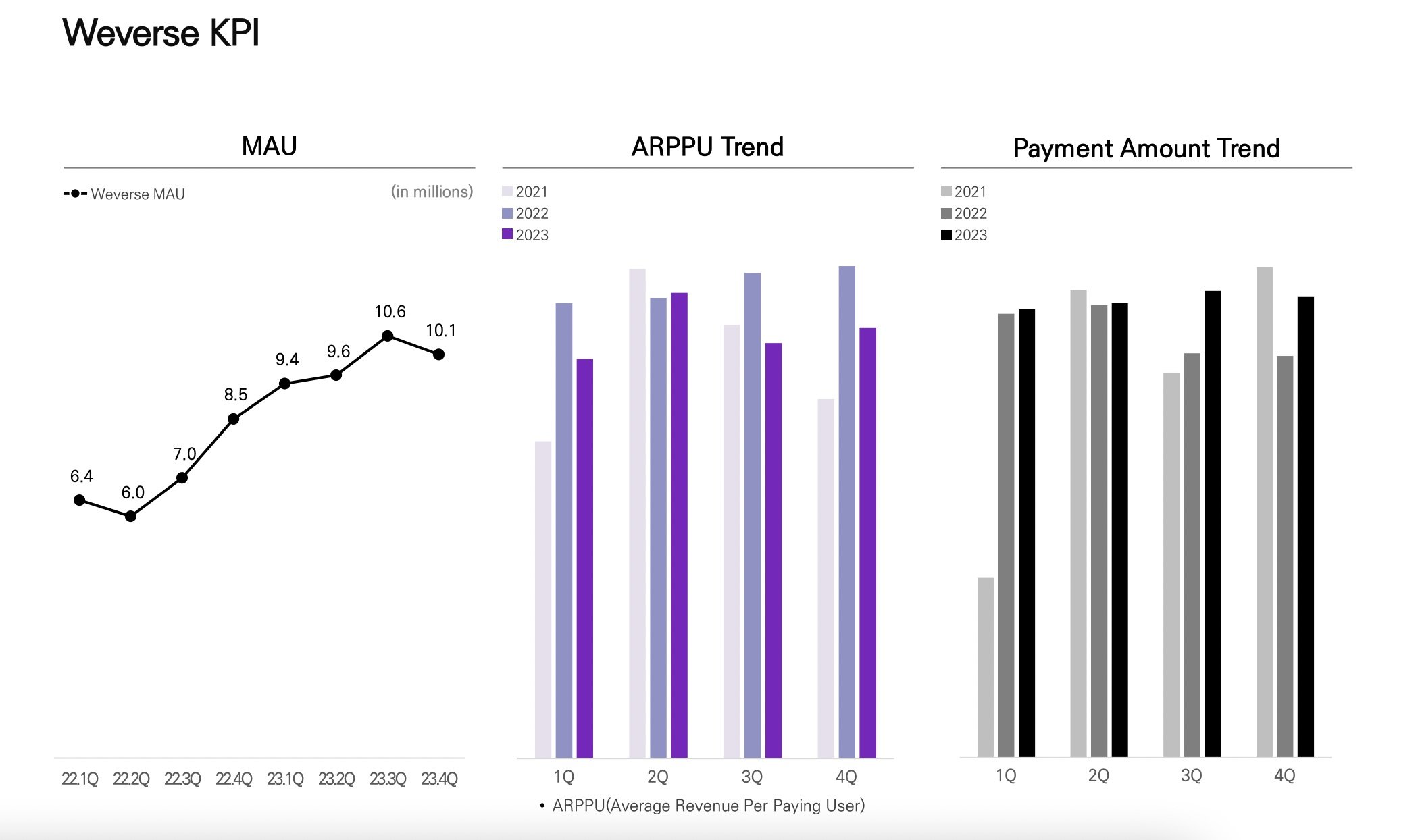 HYBE reported that Weverse counted 10.1 million Monthly Active Users at the end of Q4 (the three months to end of December), versus 10.6 million MAUs in the prior quarter (Q3 2023).