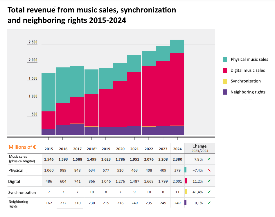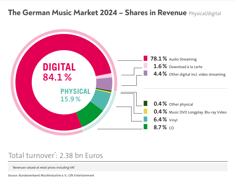 Recorded music sales in Germany rose 7.8% year-on-year to EUR €2.38 billion (USD $2.58 billion) in 2024, with digital music surpassing the two-billion-euro mark for the first time.