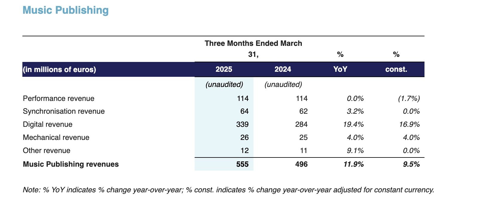 UMG’s Music Publishing division,Universal Music Publishing Group, generated revenues of €555 million ($584.02m) in Q1, up 9.5% YoY at constant currency.