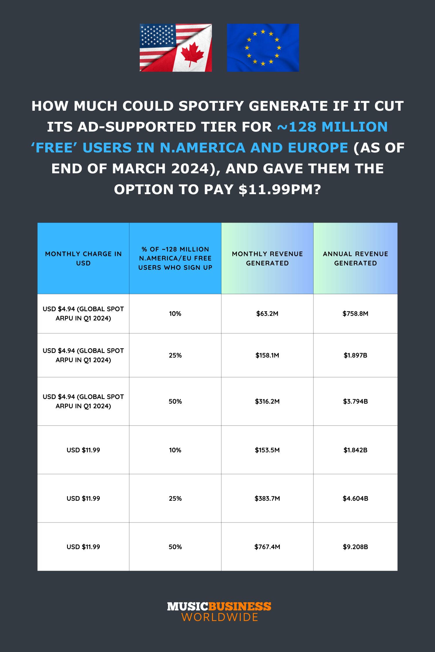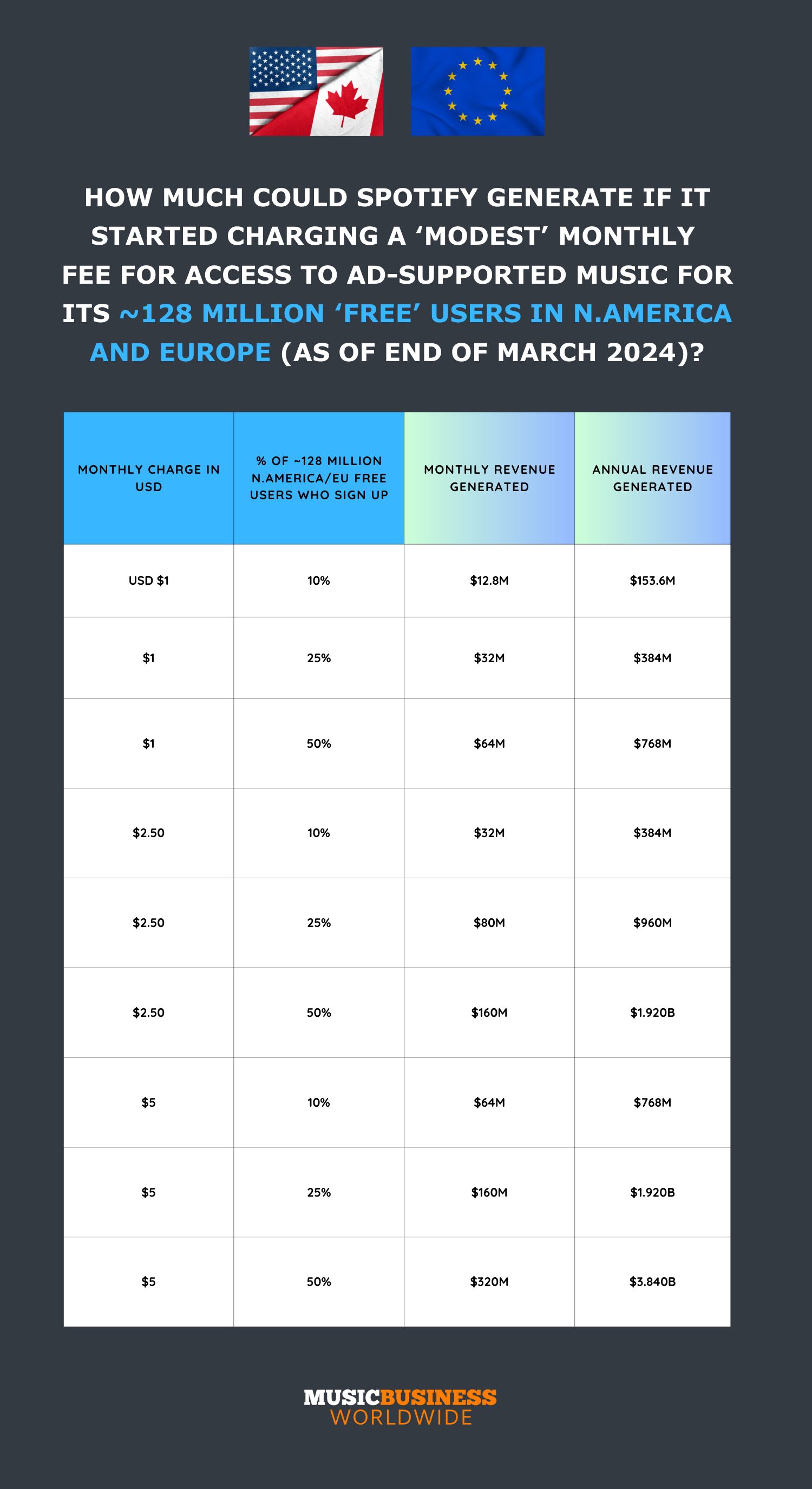 Once again, the below calculations do not consider any revenue that would continue to be generated from advertising on these tiers in these markets. They only show how much new money the introduction of a ‘modest fee’ on Spotify’s ‘free’ offering in North America and Europe might generate.