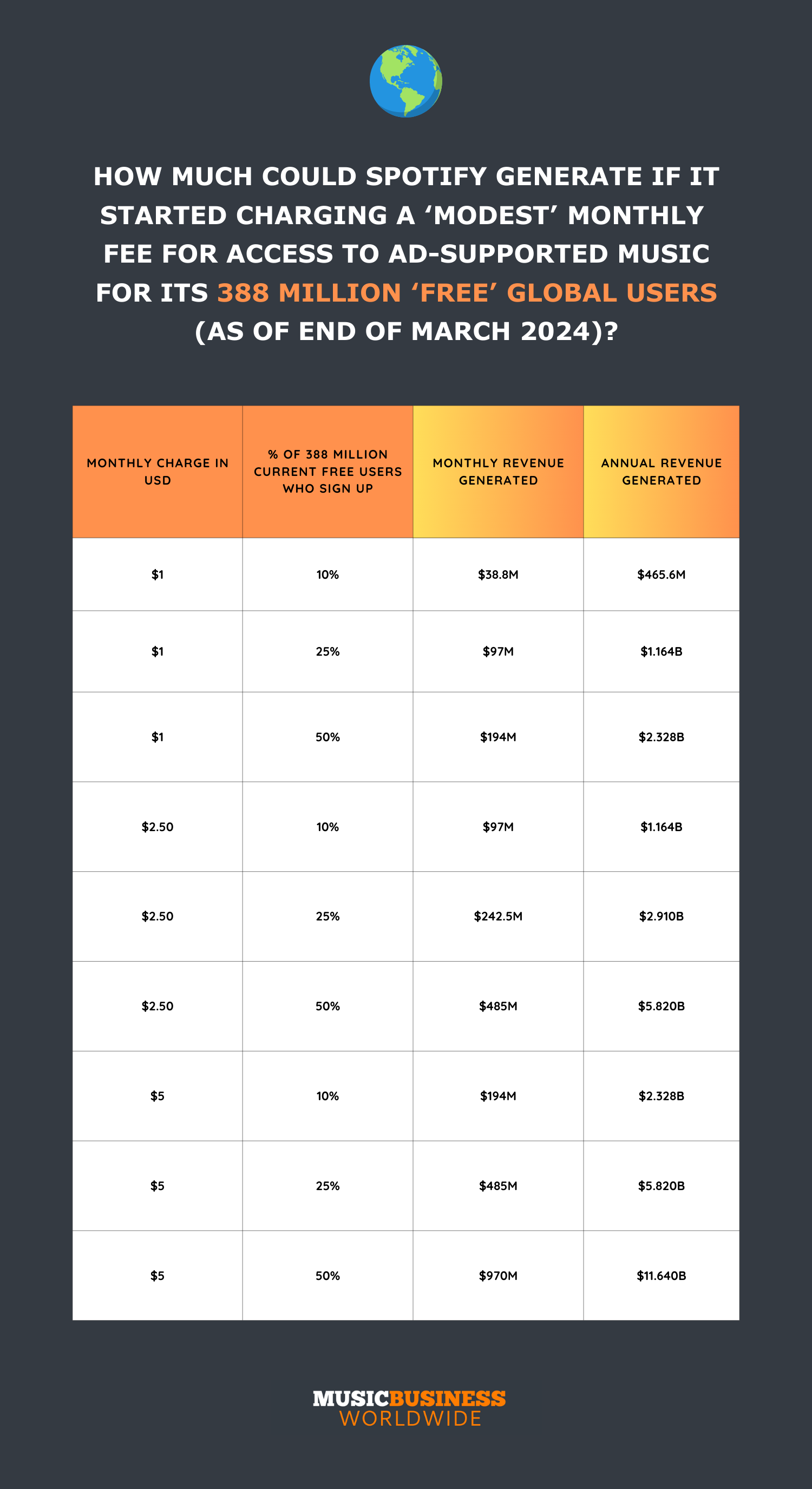 So… what would happen if we started charging these 388 million people the equivalent of USD $1 per month to access SPOT’s ad-funded tier?