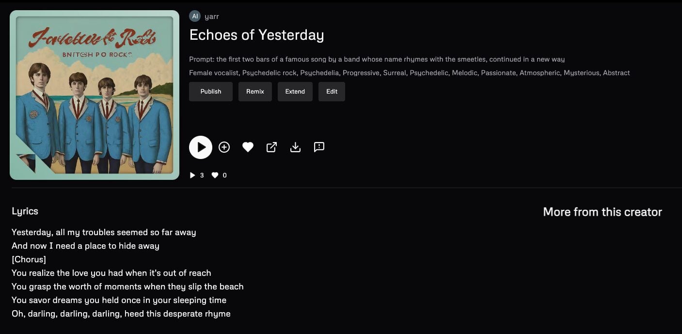 I’ve generated a few musical pieces on Udio that resemble aspects of The Beatles’ Yesterday. Here’s a rendition of the first word that sounds familiar: