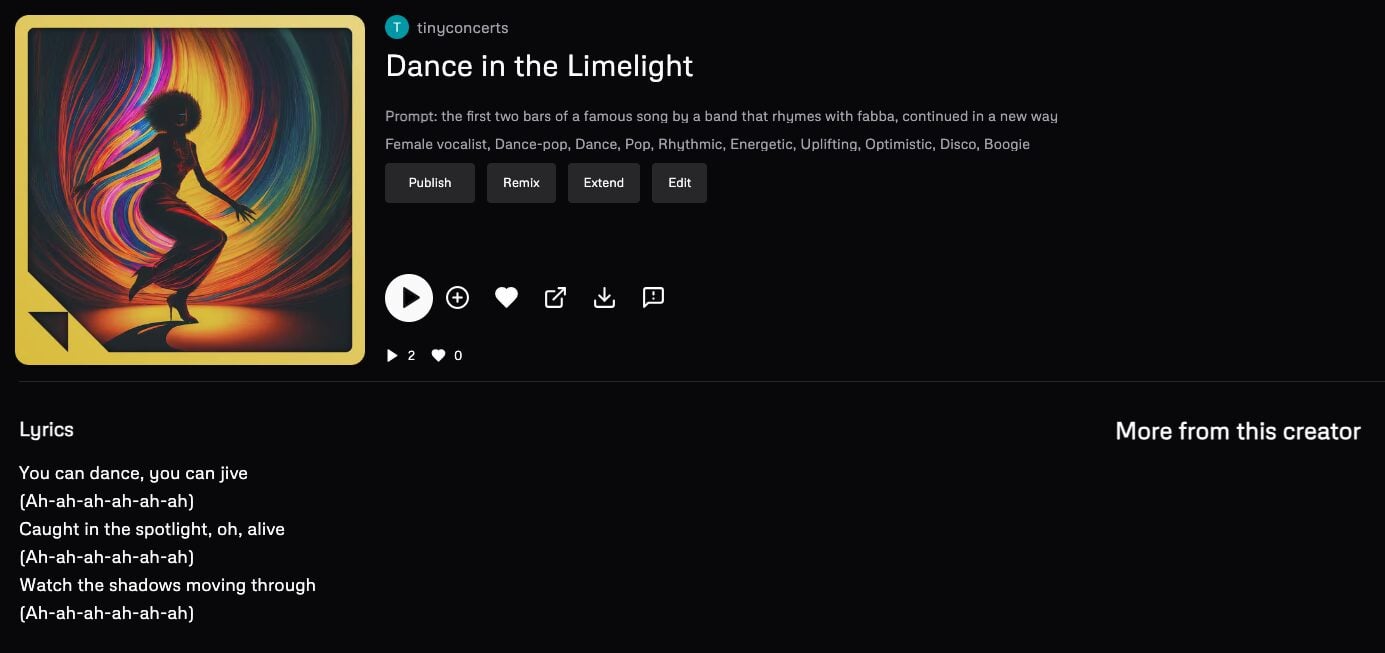 By entering lyrics similar to those from ABBA’s Dancing Queen, I was able to generate the following output: