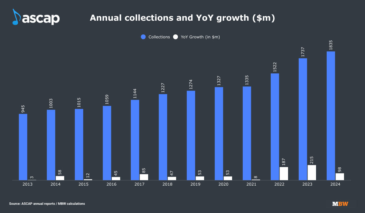 Revenue came in at $1.835 billion for calendar 2024, up 5.7% year over year. Of that, ASCAP distributed $1.696 billion to artists, songwriters, and music publishers, an increase of 6.5% YoY.
