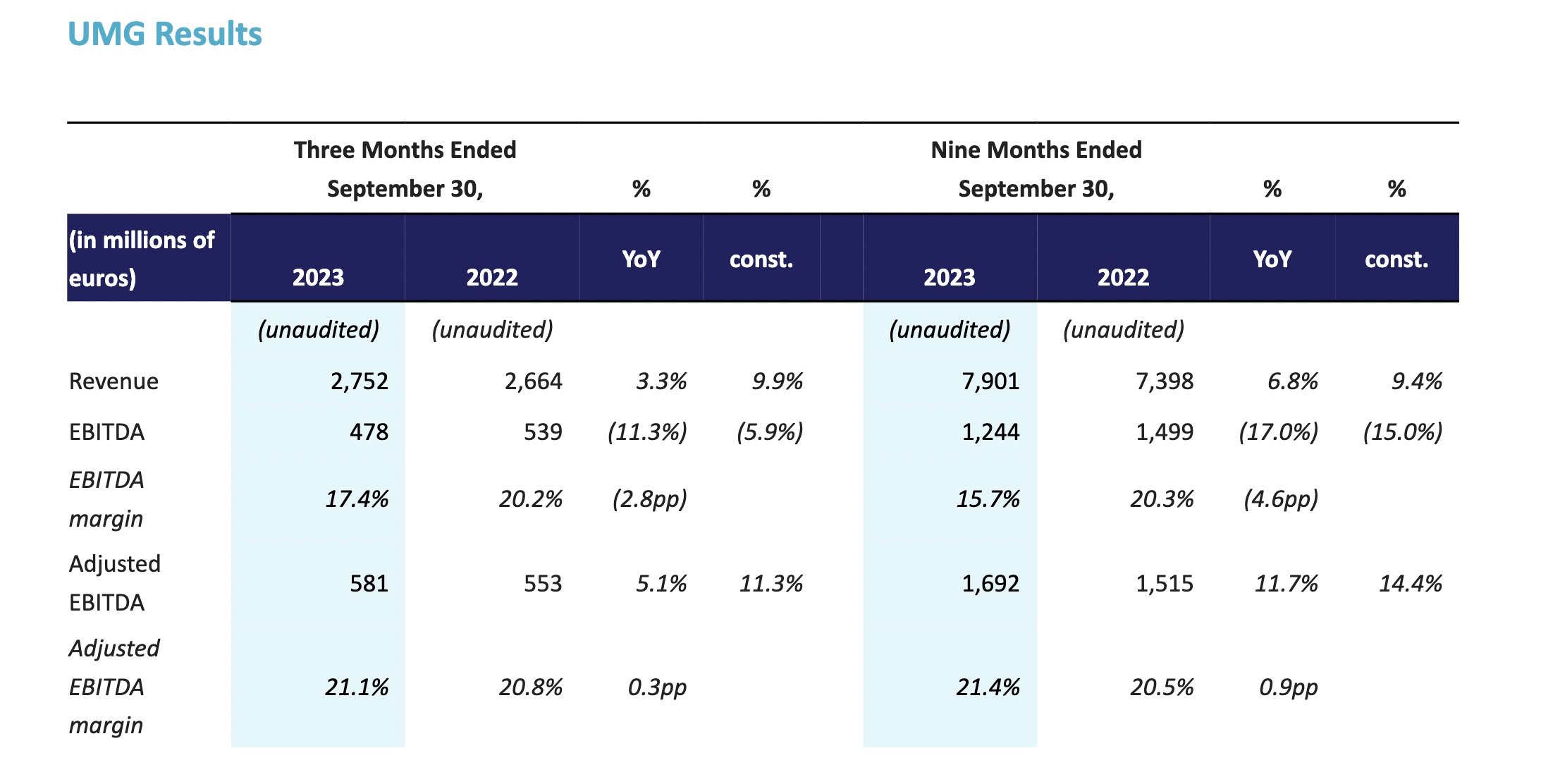 According to UMG, its EBITDA and EBITDA margin were impacted by non-cash share-based compensation expenses of €103 million during Q3 2023, compared to €14 million during the third quarter of 2022.