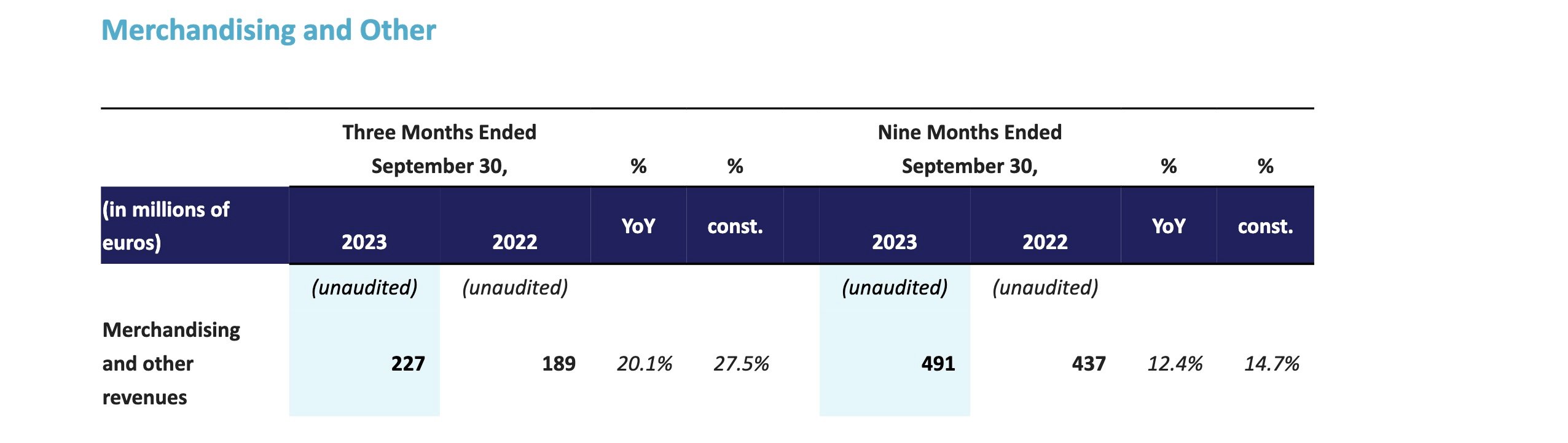 Universal’s ‘Merchandising and Other’ revenue in Q3 reached €227 million ($247.06m), an increase of 27.5% YoYat constant currency, driven “by growth in direct-to-consumer sales and higher touring merchandise sales”.