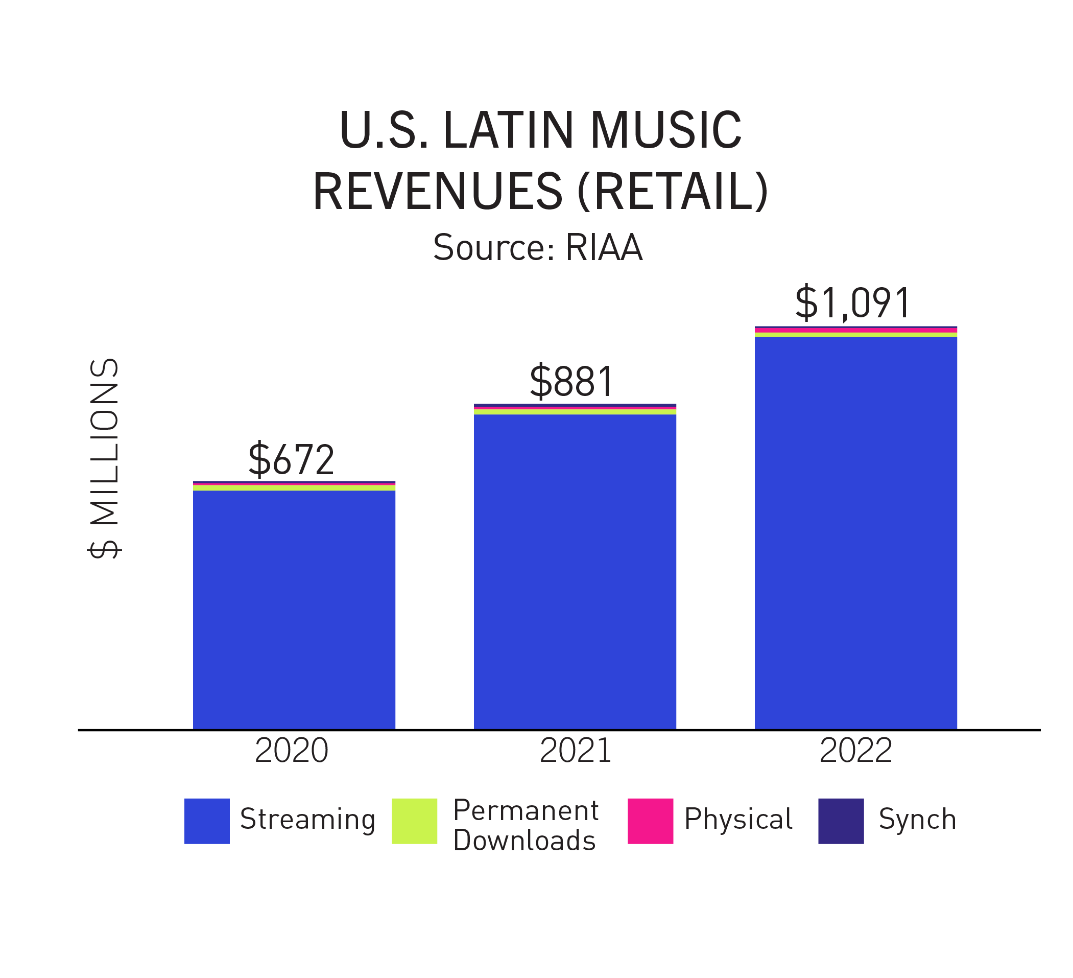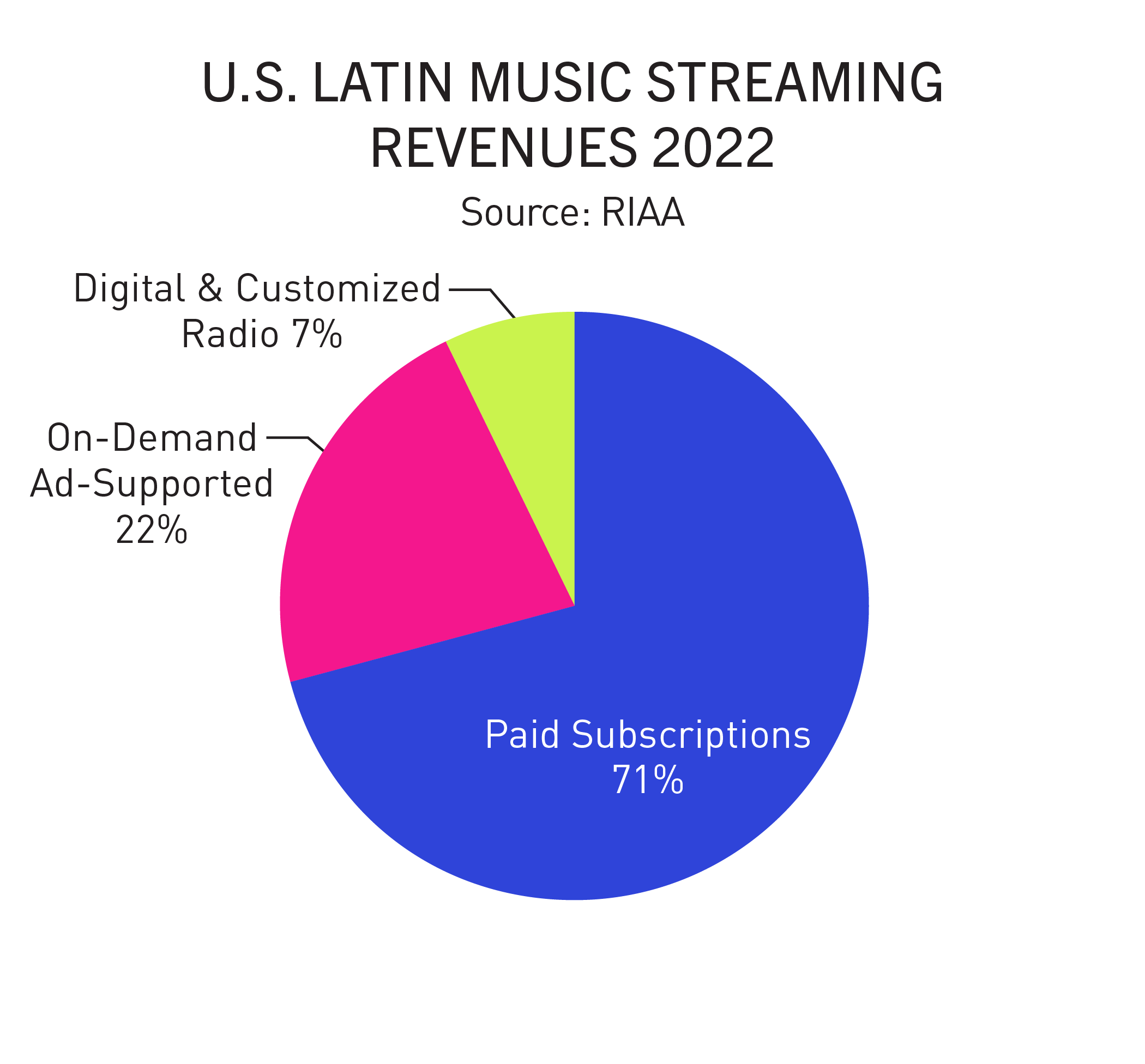 Paid subscriptions saw the strongest revenue growth for Latin music in 2022, up 28.7% YoY to $758.3 million.