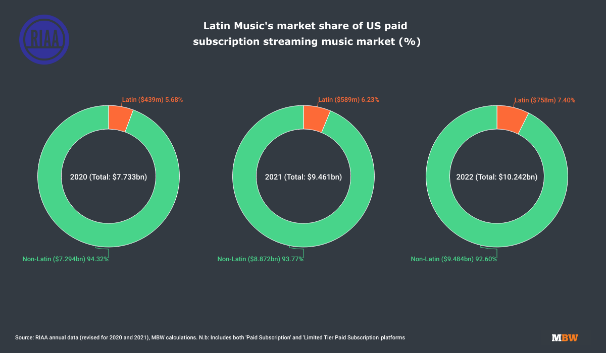 MBW calculations based on the latest RIAA data show that Latin music claimed a 7.4% market share of the US’s subscription/paid music streaming market in 2022 (inclusive of both premium and ‘limited tier’ subscription products).