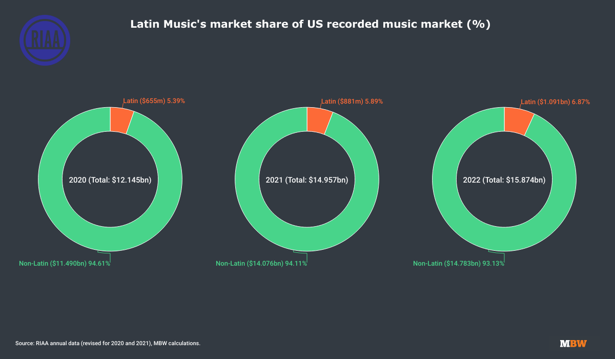 Latin music, in turn, claimed an 8% market share of total US streaming revenues last year, according to MBW calculations of RIAA data (see above).