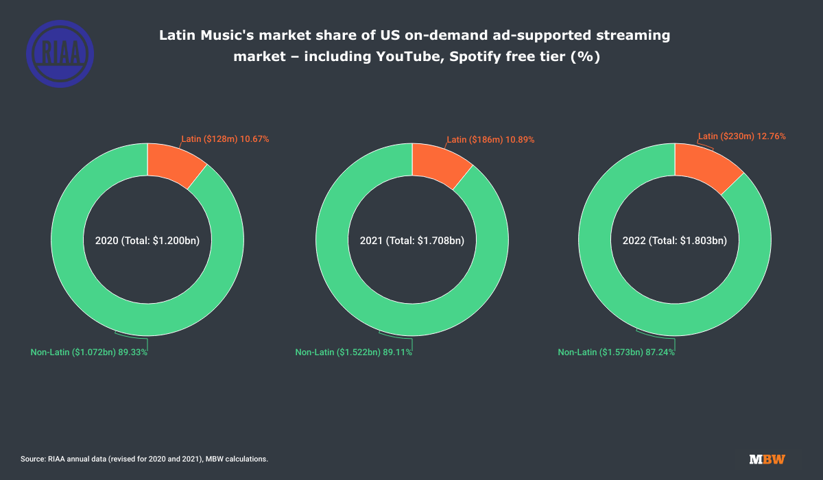 MBW’s calculations, again based on RIAA data, show that Latin music’s market share of on-demand, ad-supported streaming in the US last year surpassed 12.7% (see above).