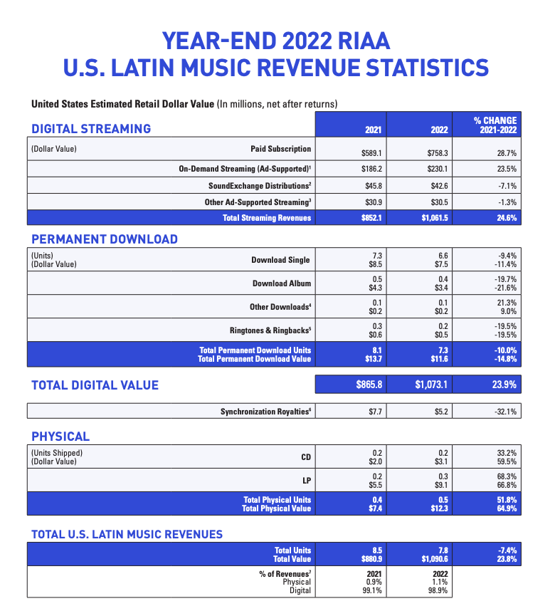 You can download the RIAA’s full annual report about Latin music’s success in the US in 2022 through here, or see a snapshot of the key numbers below.