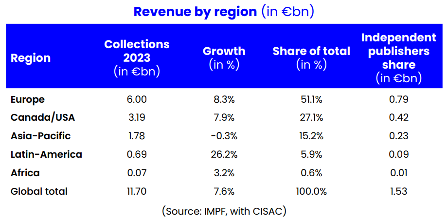 Using data from CISAC, the global umbrella group of CMOs and performing rights organizations (PROs), the IMPF broke down publishers’ revenues by region. It found that Europe remains the largest source of collections, at €6.0 billion ($6.5 billion) in 2023, up 8.3% YoY, of which €0.79 billion ($0.85 billion) went to indie publishers.