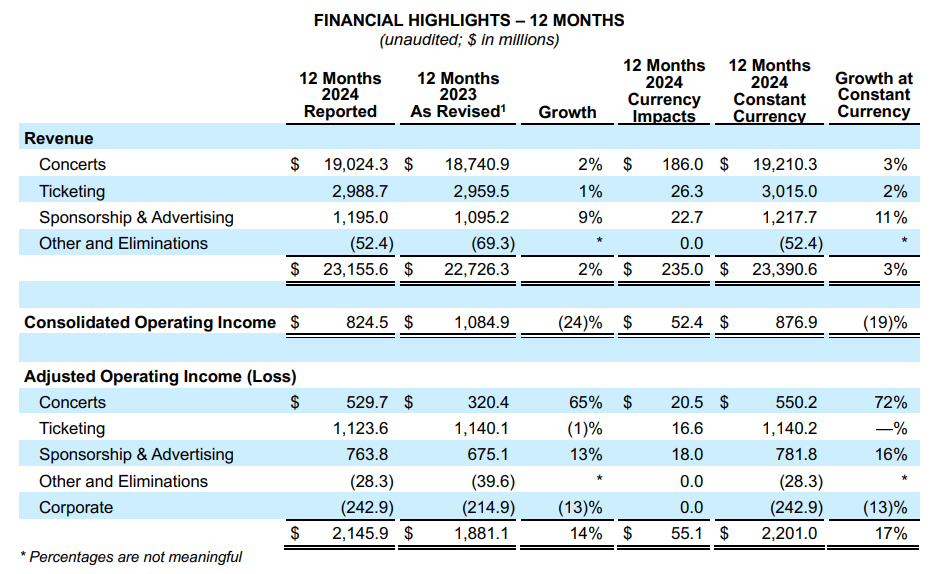 “2024 was live music’s biggest year yet, as artists toured the world and fans turned out in record numbers,” CEO Michael Rapino said in a statement.