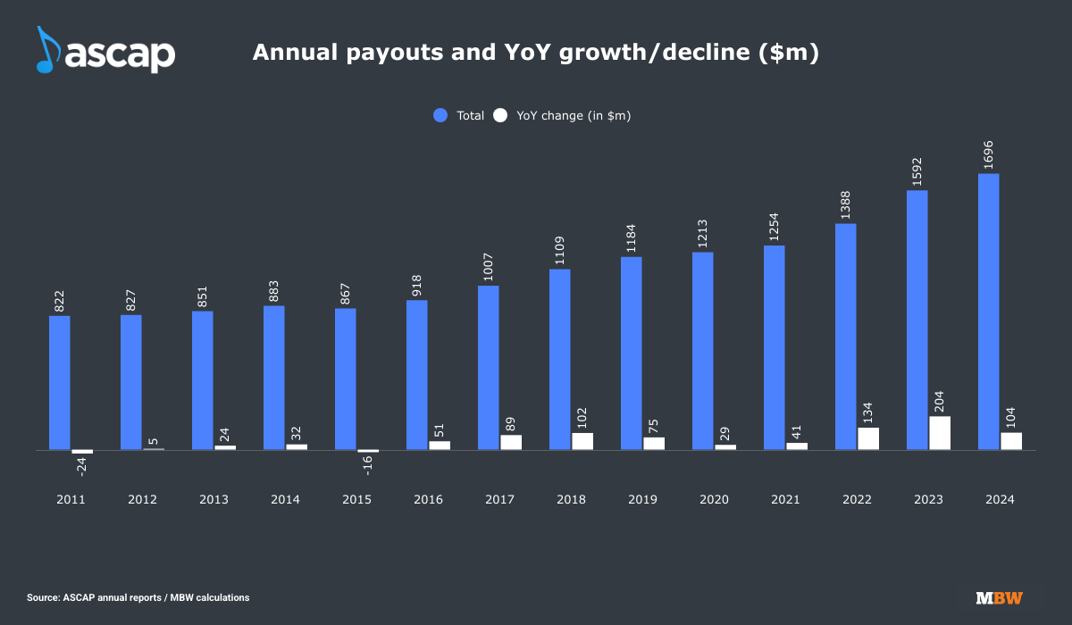 US-based collection and licensing society ASCAP annually confirms its yearly total collections and its annual payouts to members.