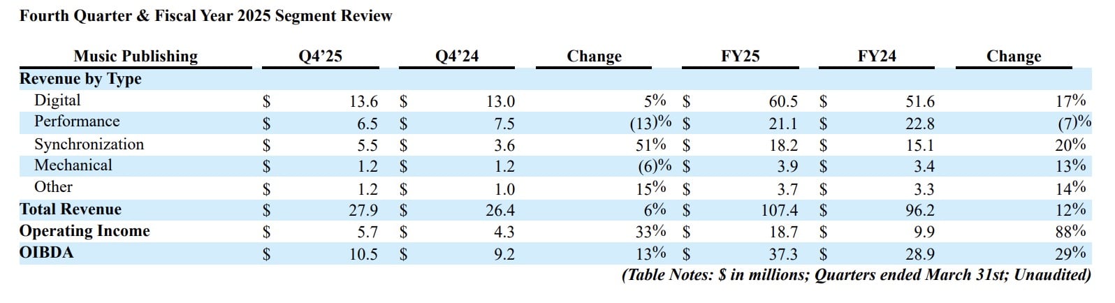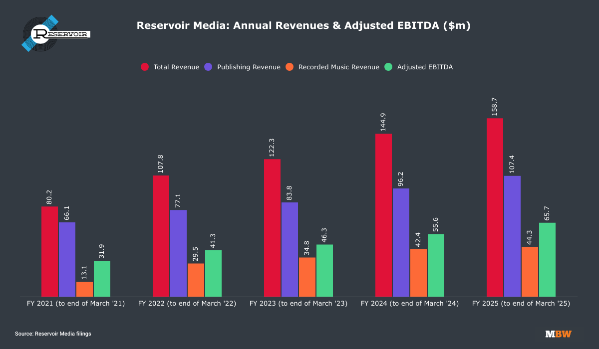 Recorded Music Revenue in Reservoir’s FY fiscal 2025 was $44.3 million, an increase of 4% YoY compared to $42.4 million in the prior year.