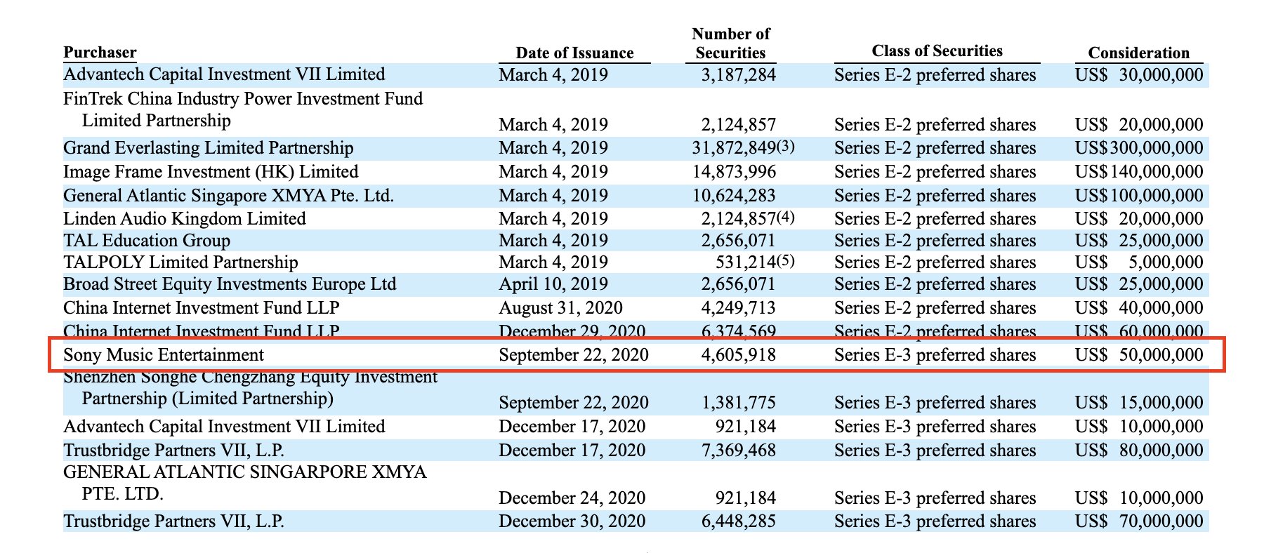 According to an SEC filing reviewed by MBW, Sony Music acquired 4.6 million Series E-2 preferred shares in Ximalaya for a consideration of USD $50 million in 2020.