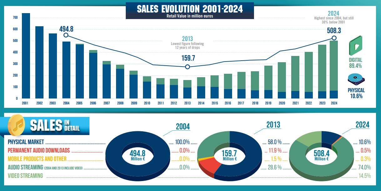 With €249.8 million in revenue in the first half of 2024, this means recorded music revenue in Spain reached €319 million in H2.