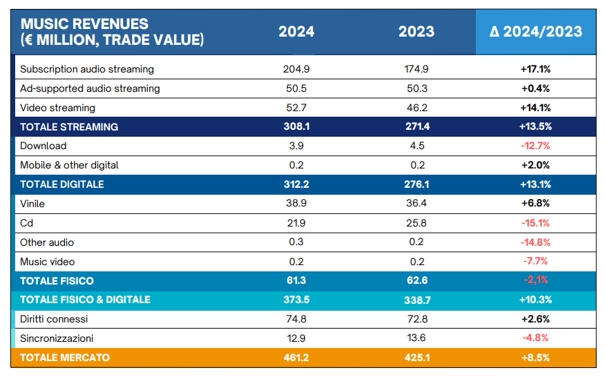 Italy’s recorded music market – the third largest in the European Union, behind Germany and France – saw an 8.5% year-on-year increase in revenue in 2024, driven by a 17.1% increase in subscription streaming revenues.