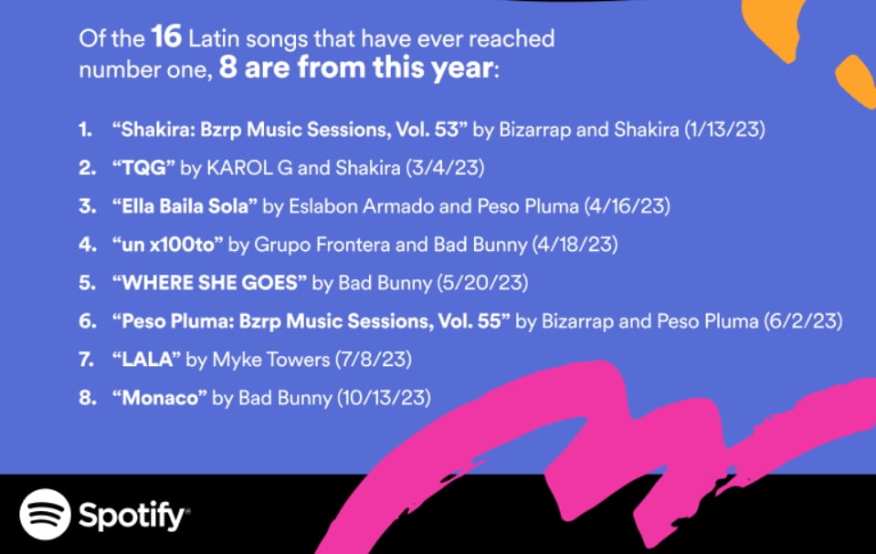 In 2023, more than one in five of the Top 100 tracks on the platform were Latin, and of the 16 Latin songs that ever reached No. 1 globally, eight were from this year.