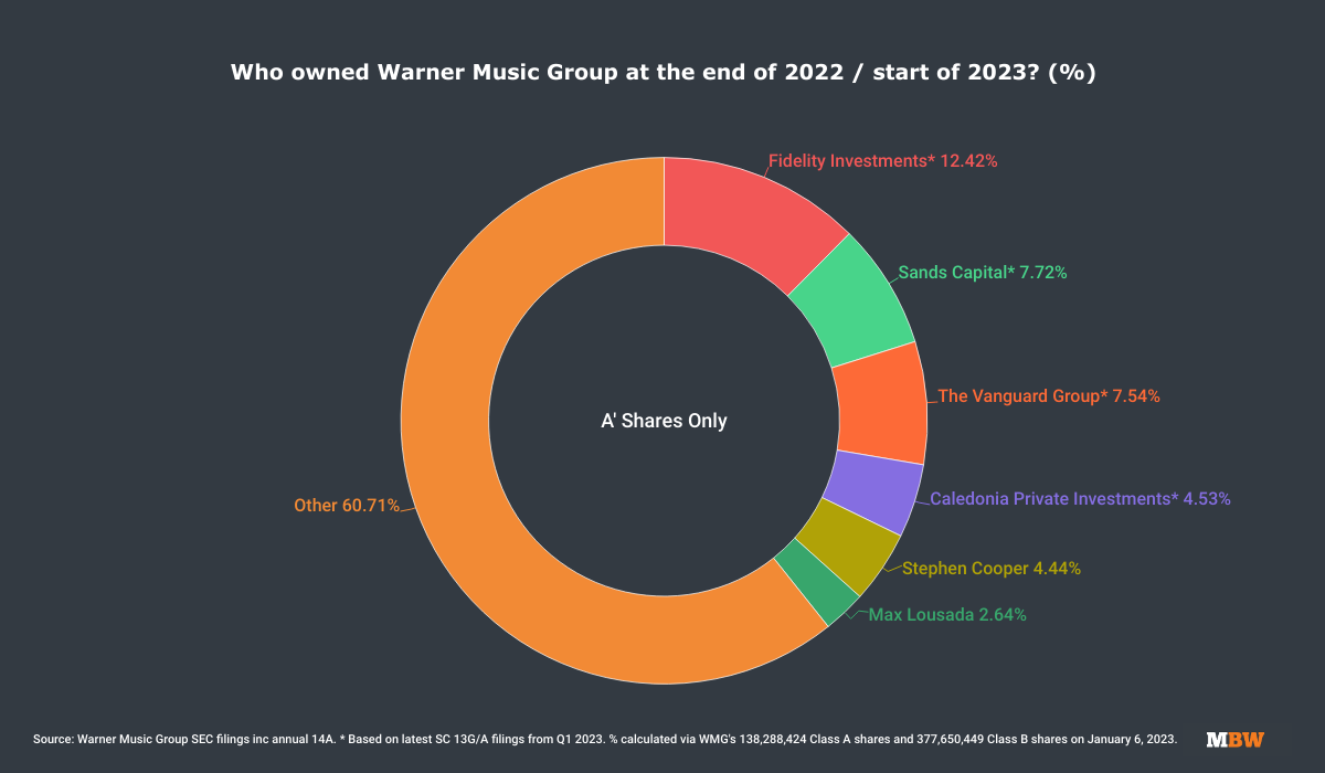 According to MBW’s calculations, that gave Fidelity 12.42% of all WMG’s Class A shares, or 3.33% of the total company (including Class B shares).