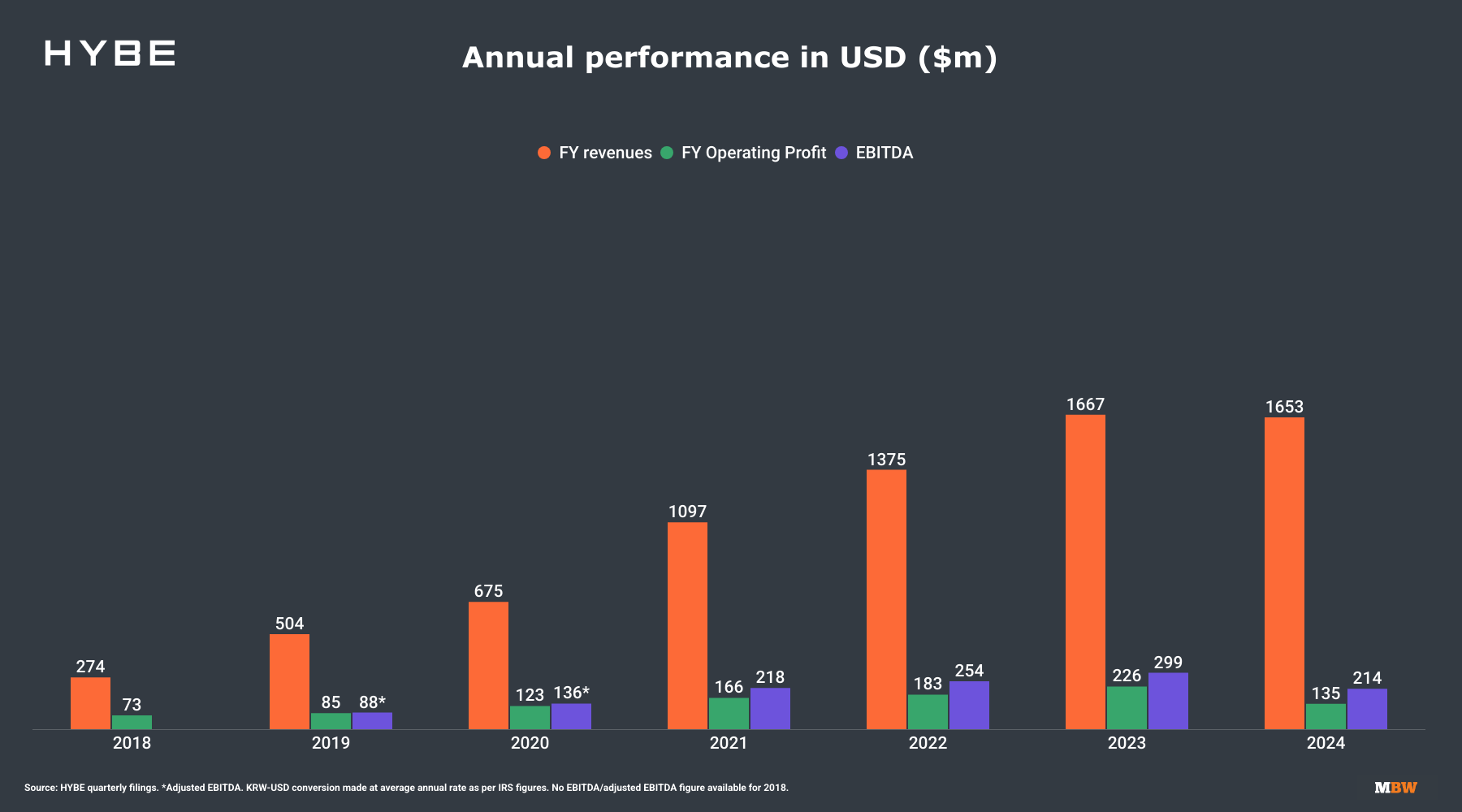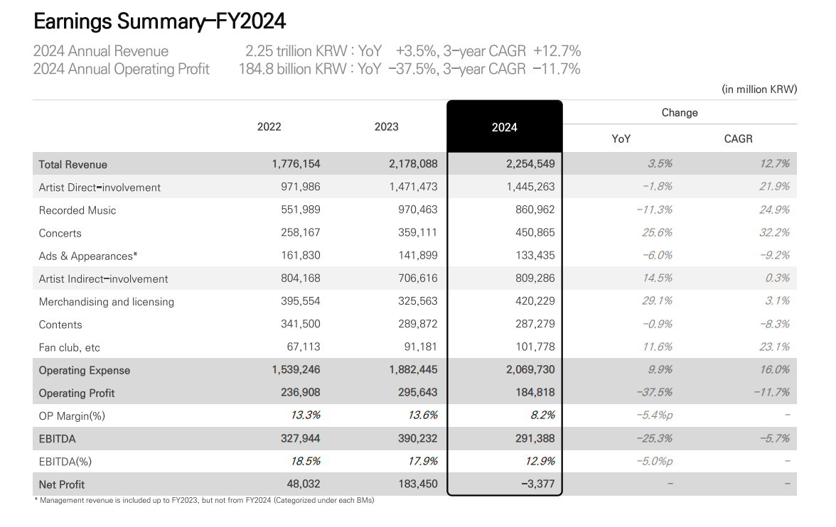 In latest earnings report, HYBE recorded revenues of KRW 2.2545 trillion, or USD $1.654 billion at the average exchange rate for 2024. That was up by 3.5% year-on-year.
