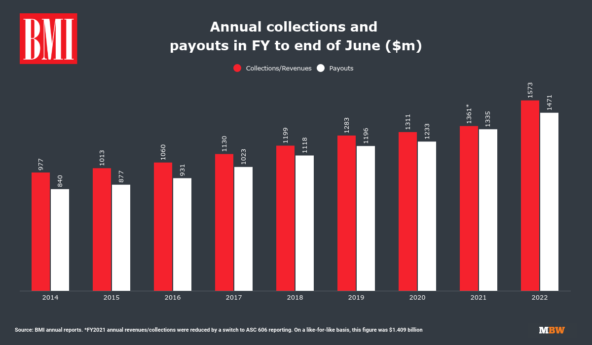 By comparison, BMI’s principal rival, ASCAP, collected $1.522 billion in calendar 2022. Between the two of them, BMI and ASCAP account for some 90% of the US music licensing market.