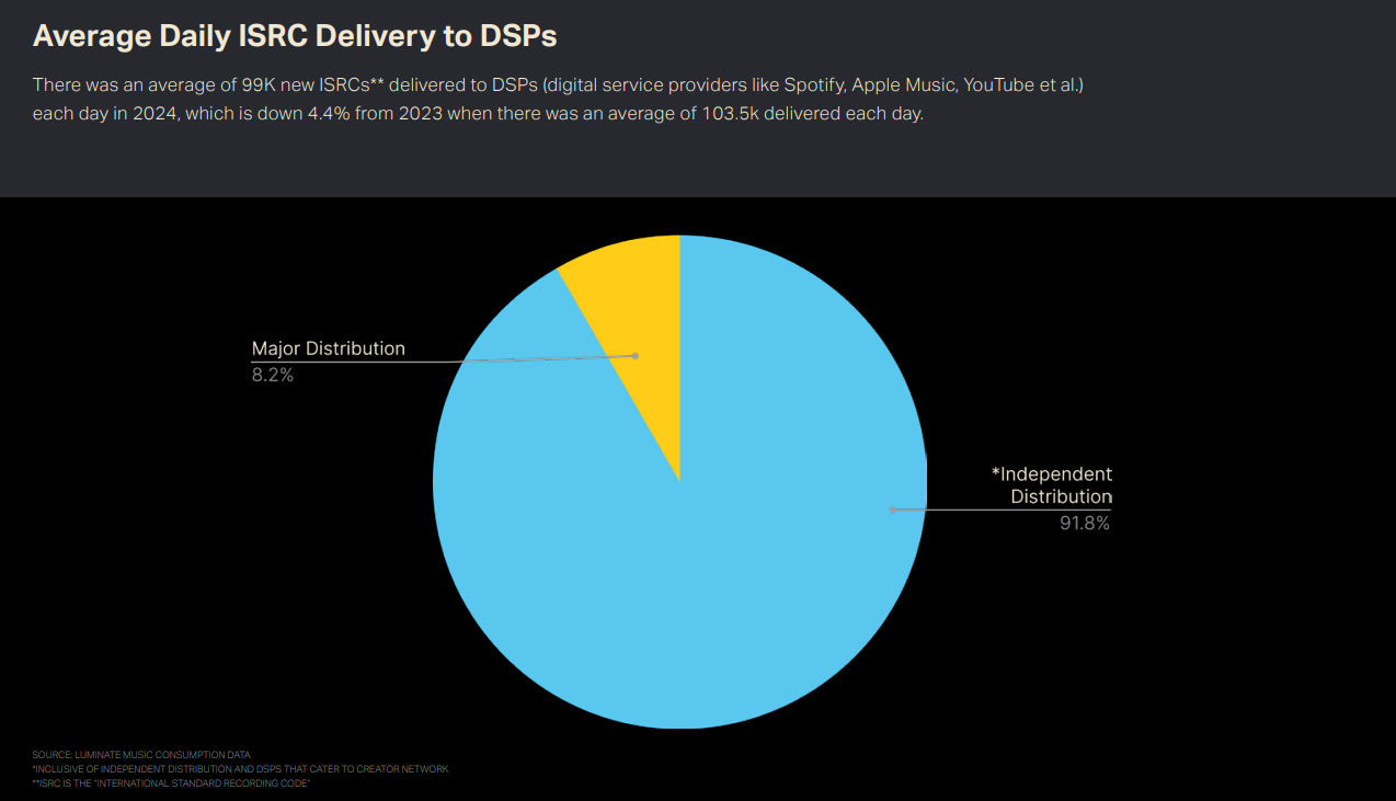 Notably, Luminate says that 8.2% of the tracks uploaded in 2024 came from major distributors, while 91.8% came from indie distributors. This implies that some 8,100 songs are being uploaded daily by major music players – not an insignificant flood in and of itself.